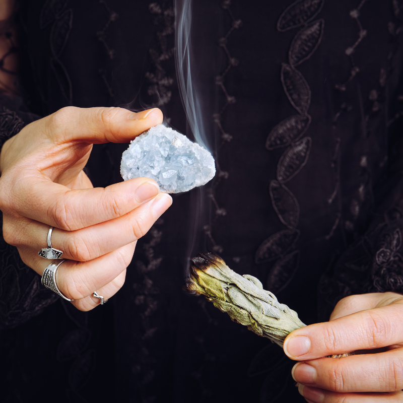 To smudge crystal jewelry or any space, begin by lighting the tip of your sage bundle until it produces a steady stream of smoke.